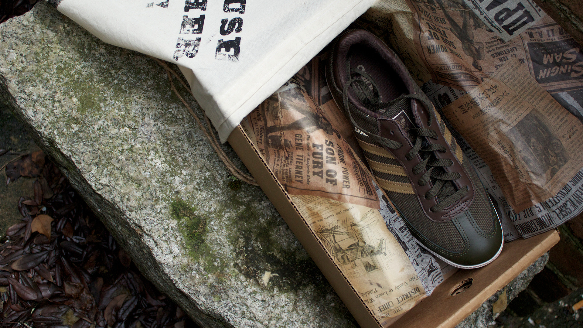 Travel-themed package design for Adidas Sambas. Senior year. All elements made completely from scratch, including hand-sewn and screen printed bag, textured tissue paper, cardboard box die lines, and sticker.