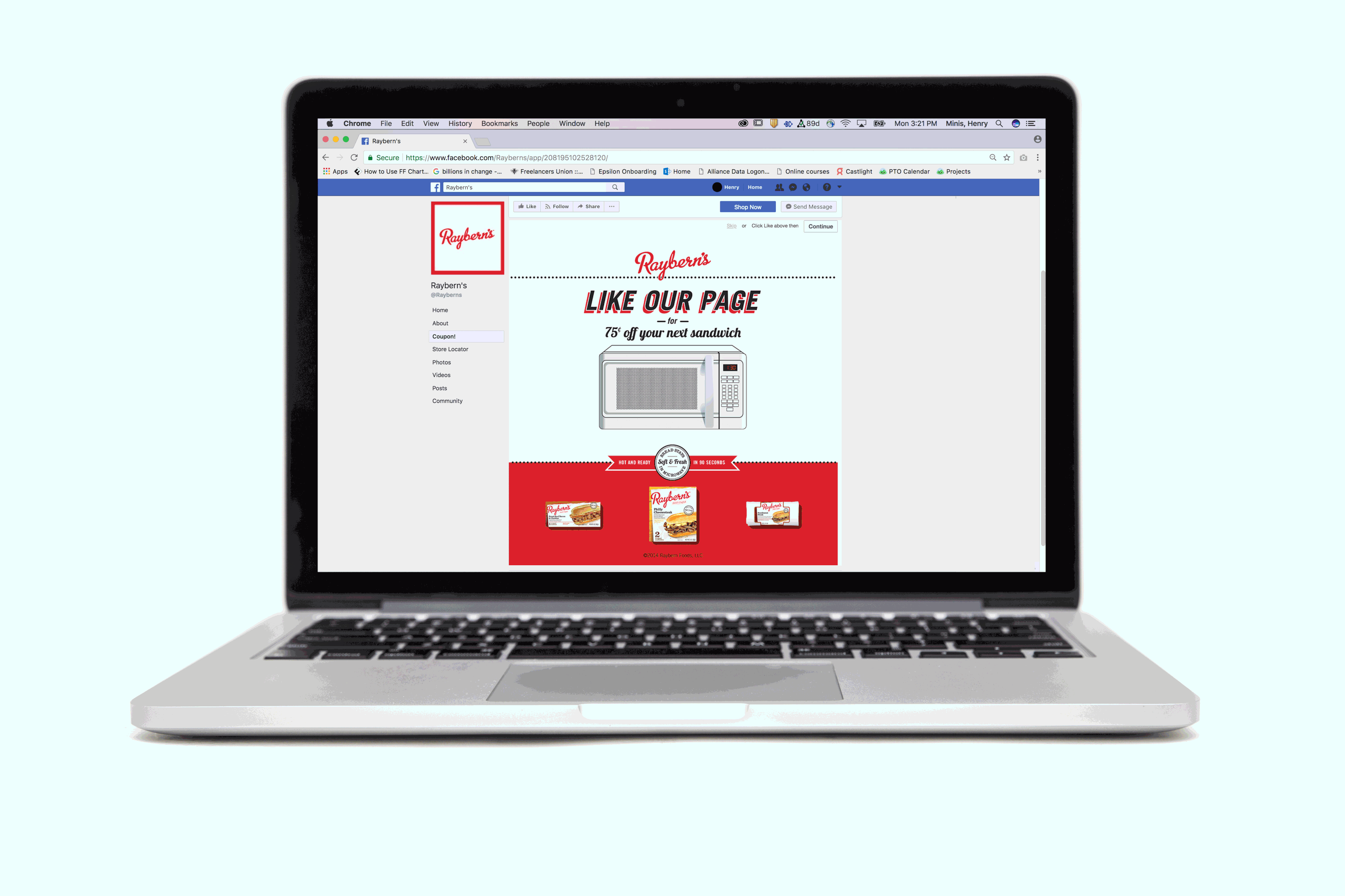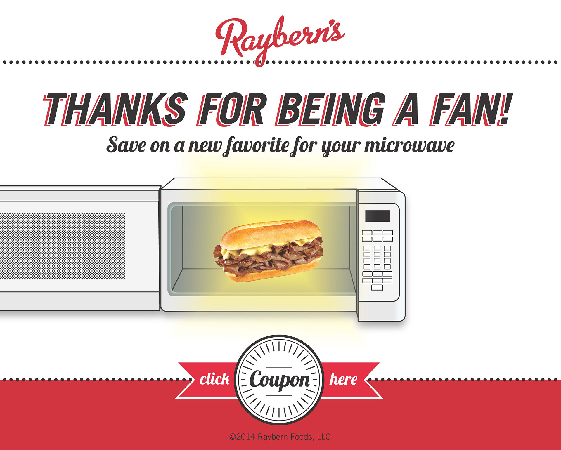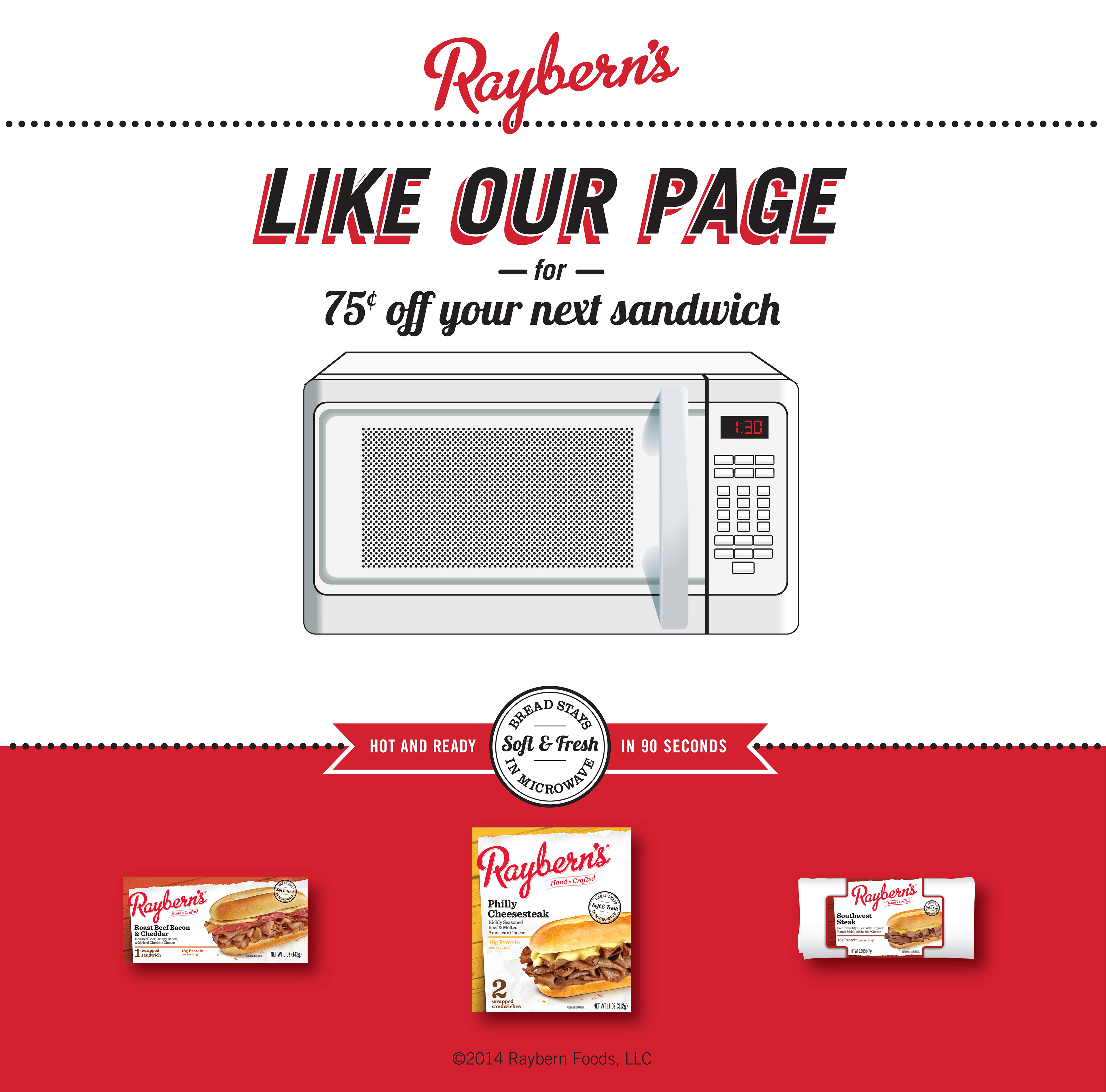 These layouts were designed as part Raybern's Facebook Page page in order to incentivize consumers to like their page by offering a coupon in return. Microwave vectors were built from the bottom up in Adobe Illustrator.